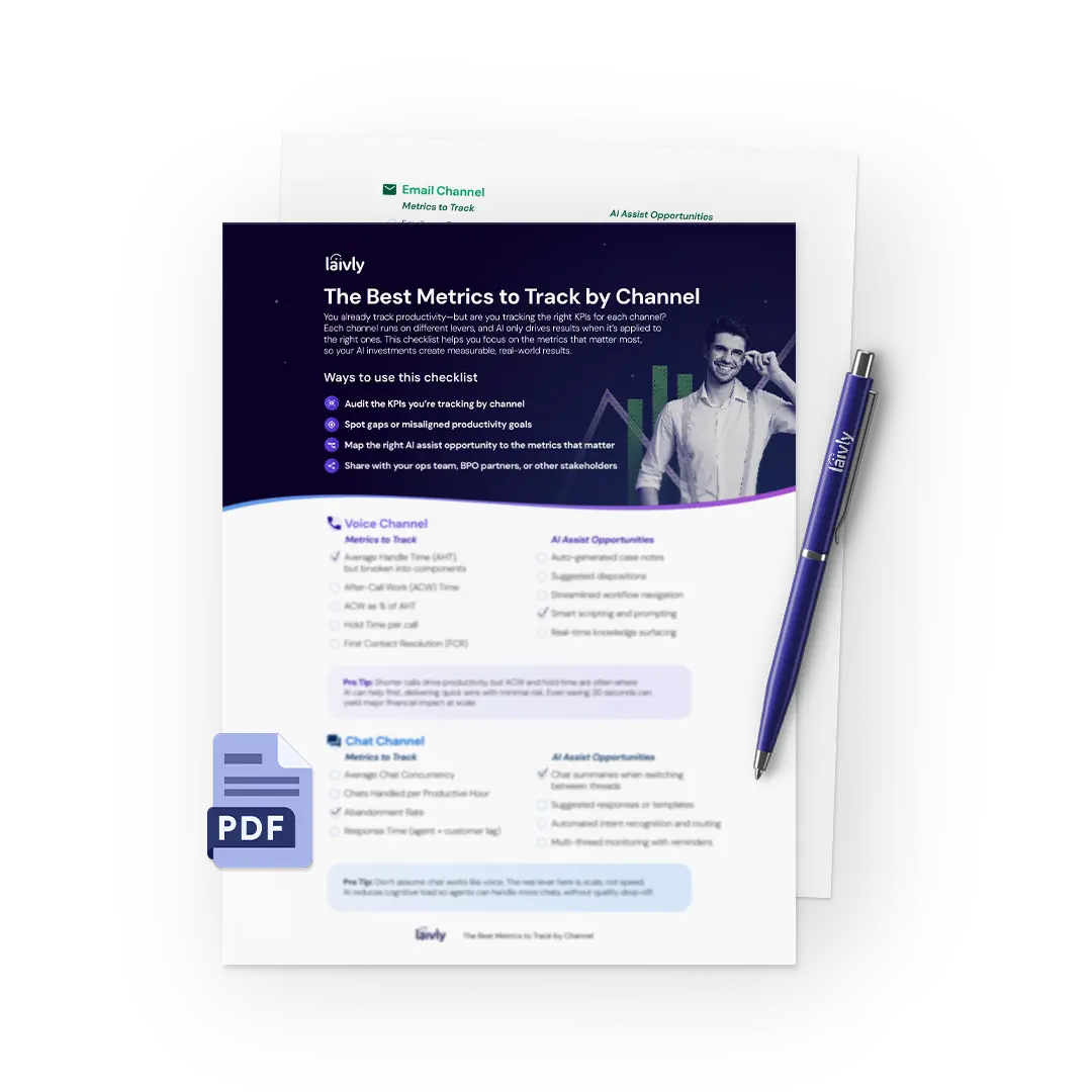 In multichannel contact centers, it’s easy to fall back on blanket metrics like average handle time. But voice, chat, email, and SMS each require different levers, and different ways to measure success. This checklist helps you identify misaligned metrics by channel, prioritize the KPIs that actually impact productivity, and uncover where AI can really make a difference. Because if your AI tools aren’t delivering ROI—the problem might be your metrics.